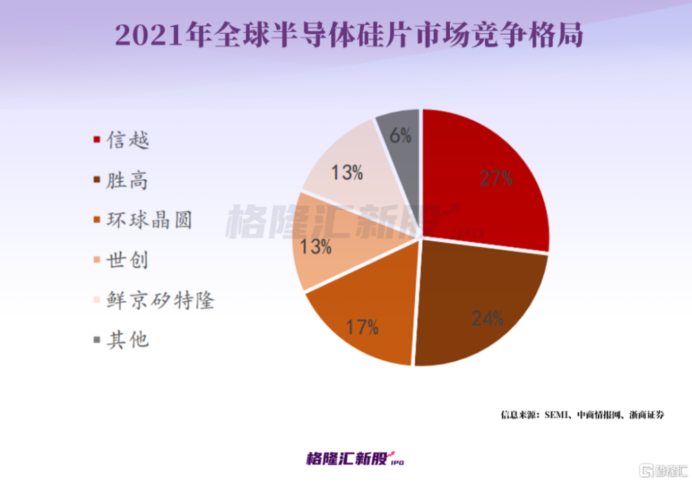 2021年,日本的信越化学和胜高、中国台湾的环球晶圆、德国的世创、韩国的鲜京矽特隆这前五大龙头硅片厂商垄断了全球90%以上的市场份额。